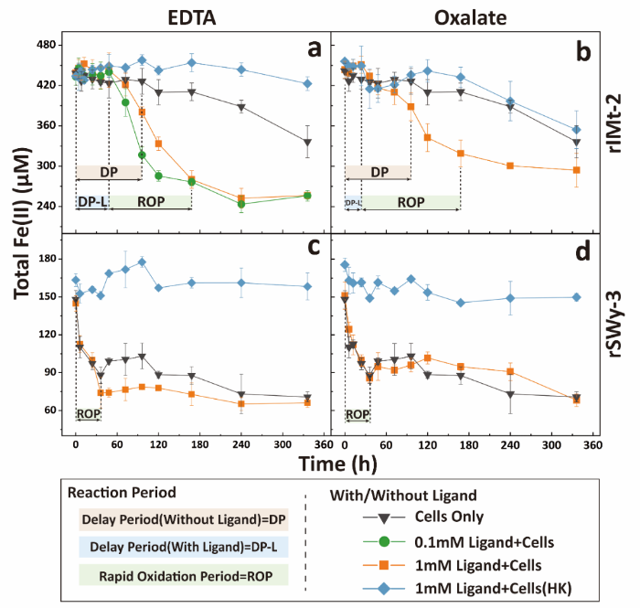 针对以上问题,我校博士生胡大福在地学院曾强副教授和董海良教授的指导下,选取了两种典型有机配体(乙二胺四乙酸、草酸)、两种黏土矿物(伊利石、蒙脱石)以及一株模式铁氧化菌Pseudogulbenkiania sp. Strain 2002,采用多种湿化学和矿物学研究方法,探讨了不同有机配体存在和不存在的情况下的NDFO过程与电子转移机理。