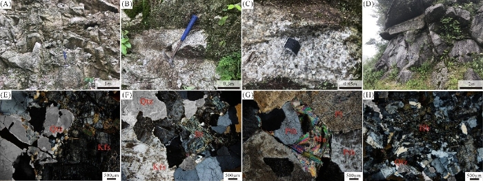 图2 (A-D)苗儿山-越城岭岩基花岗质岩石野外照片和(E-H)显微照片