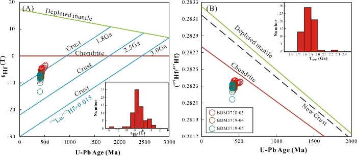 聚焦上述科学问题,我校地球科学与资源学院博士苑新晨在刘俊来教授的指导下,对华南地块钦杭结合带内的早古生代苗儿山-越城岭杂岩体内的花岗质岩石,利用LA-ICP-MS锆石U-Pb、Lu-Hf同位素以及全岩主微量地球化学特征的方法进行了成岩时代、物质来源以及组成的研究,聚焦“深部地幔对流体制对早古生代华南板块陆内造山的影响”,开展了深入研究,取得如下认识:
