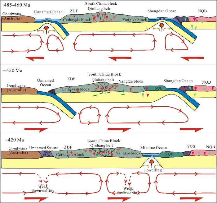(3)在原特提斯洋闭合期间,双层地幔对流主导着大洋闭合和(超)大陆会聚,其中浅部地幔对流控制着板块相互作用,包括了板块俯冲、大陆聚合、陆-陆碰撞等。而深部地幔对流作为传送带,导致Gondwana大陆为中心的浅部地幔对流系统的运送,进而促进浅部板块相互作用。同时,华南地块与Gondwana大陆的碰撞伴随着深部地幔对流体系的变化,旧的地幔对流系统在碰撞过程中消亡,而与Greater-Gondwana裂解有关的新地幔对流系统随之出现。新的地幔对流体系引发了钦杭结合带及邻区造山后伸展、下地壳部分熔融和大量花岗质岩浆活动的出现。