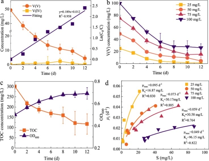 (1)确定了细黄链霉菌具有还原V(V)的能力(图1)。在12 d反应后其对V(V)的去除效率为91.0 ± 4.35%,遵循伪一级动力学模型,TOC浓度随时间逐渐降低,并且微生物的生长符合Monod方程。