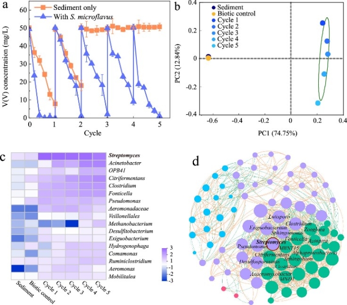 图3 细黄链霉菌生物强化后沉积物的V(V)去除性能和微生物群落动力学