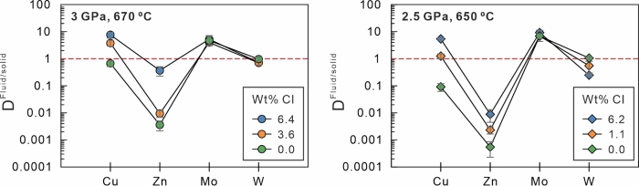 图4 Cu、Zn、Mo、W在俯冲洋壳释放流体与平衡固相之间的分配系数