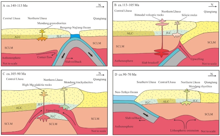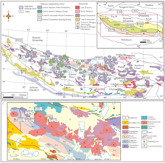 青藏高原经历了多阶段特提斯洋的形成和演化、大陆碰撞造山的动力学过程,是研究大洋岩石圈俯冲、消亡和大陆碰撞过程及对应岩石圈成分演化的理想场所。青藏高原中部班公-怒江特提斯洋盆的萎缩和消亡最终导致拉萨-羌塘地块发生碰撞,伴随大量中酸性岩浆岩活动,这些岩浆作用为揭示大洋俯冲消亡至大陆后碰撞时间的地壳组成和结构提供了很好的机会。