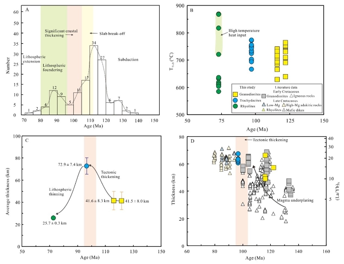 图3 北拉萨地块中生代岩浆作用以及TTi-Zr和地壳厚度变化