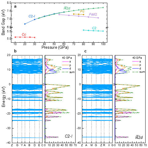 图1 CaC2O5s的电子性质。a为CaC2O5s在各自结构转换压力下的带隙;b、c分别为CaC2O5-C2-l 和 CaC2O5-I 2d在40 GPa条件下的能带结构和态密度。