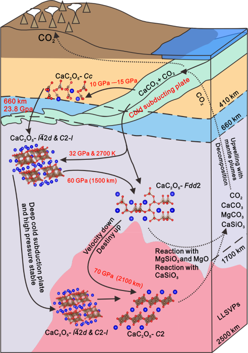 CaC2O5是一种通过结构搜索及第一性原理模拟所发现的具有多种结构相的碳酸盐矿物,在高温高压条件下通过金刚石压腔(DAC)实验成功合成(CaCO3 + CO2)。人们研究发现CaC2O5可以在上地幔至核幔边界温度压力条件下稳定存在。虽然多种CaC2O5同质多相的晶体结构、电子性质和可能的相变已经被前人广泛报道,但是还没有统一的研究描述它们可能对地幔结构和物质组成、深部地震波速及对地球内部碳循环的影响。