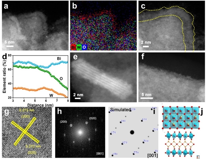 图1. a, c) Vw-BWO沿[001]方向的TEM图像。b) Vw-BWO的EDS图谱。d) 沿着Vw-BWO纳米片边缘的EDS线扫的平均值。e) 垂直于[001]的Vw-BWO的TEM。f) 沿着[001]方向的BWO的TEM。g-i) Vw-BWO的HRTEM和FFT。j) BWO的晶体结构。
