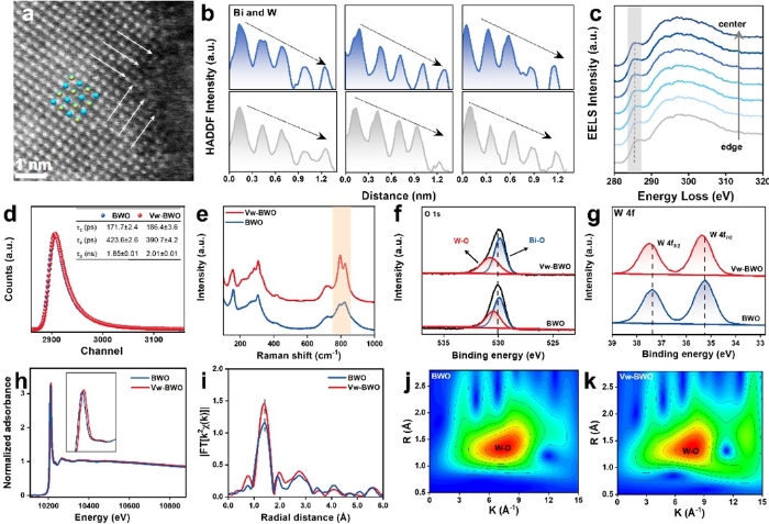 图2. a) 原子分辨率的HAADF-STEM图像以及(b) 从Vw-BWO的白色箭头标记的区域提取的线轮廓。(插图:从c轴方向视图中的BWO晶胞(Bi:黄色球,W:蓝色球)) c) Vw-BWO的W N-边STEM-EELS光谱。d, e) BWO和Vw-BWO的正电子湮灭光谱和Raman光谱。f, g) BWO和Vw-BWO的XPS光谱。h-k) BWO和Vw-BWO中的W的XANES光谱和小波转换。