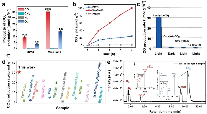 图3. a, b) 在模拟太阳光下,BWO和Vw-BWO在CO2还原过程中产生的CO、CH4、H2和O2的产率。c) Vw-BWO在不同条件下的CO产率。d) Vw-BWO与文献报道的一些典型光催化剂在相同条件下的光催化CO2还原活性的比较。e) 同位素标定实验,插图为其对应的13CO和13CO2的质谱。