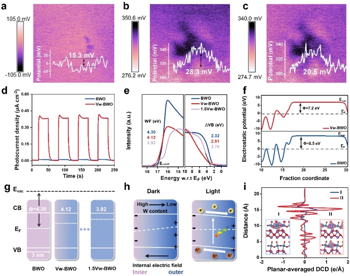 图4. a, b) BWO和Vw-BWO在暗态下、以及c) Vw-BWO在光照下的KPFM和相应的表面电位分布。d) Vw-BWO在光照下的瞬态光电流响应。e) 对应于1.5Vw-BWO、Vw-BWO和BWO的二次电子起始区和VBMs相对于(w.r.t.)费米能(EF)的UPS光谱。f) Vw-BWO和BWO的静电势。g) BWO、Vw-BWO和1.5Vw-BWO同质结的能带结构示意图。(从UPS数据中提取的材料的能级) h) W-BWO同质结在黑暗和光照下的电荷转移机制的示意图。i)界面上的平面平均微分电荷密度(DCD)。(I:具有表面W空位的BWO晶体结构;II:具有梯度W空位的BWO晶体结构。)