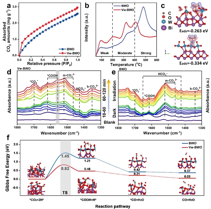 图5. a) BWO和Vw-BWO的CO2吸附等温线。b) 50-600℃下BWO和Vw-BWO的CO2-TPD曲线。c) Vw-BWO(上)和BWO(下)吸附CO2的差分电荷密度。电荷积累为紫色,耗尽为粉红色。d, e) 在CO2吸附(0-60分钟)和光还原(60-120分钟)过程中Vw-BWO和BWO的原位FTIR光谱。f) CO2还原到CO路径的自由能图。TS:过渡态。