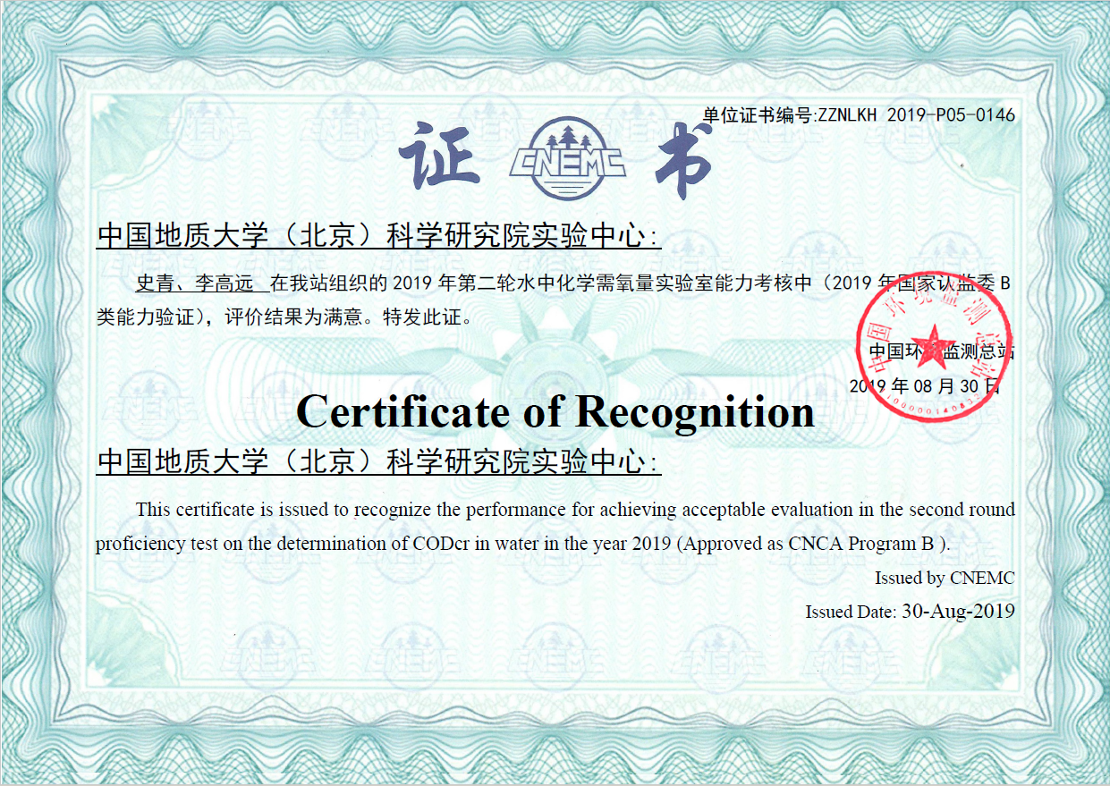 我院环境化学检测室史青、李高远两位老师近期参加了国家认监委2019年度水中化学需氧量实验室能力考核,获得满意结果。
