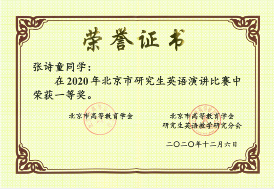 我院硕士生张诗童荣获北京市研究生英语演讲比赛一等奖