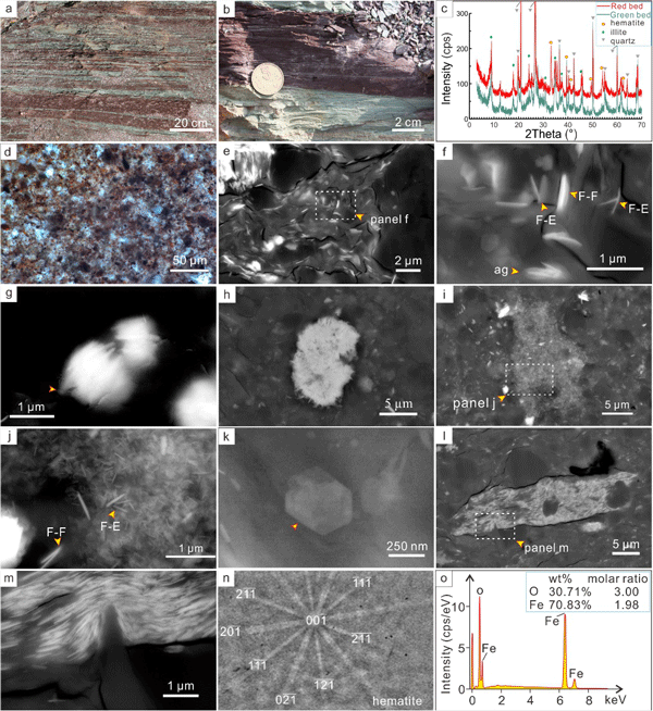 1、X射线粉晶衍射(XRD)、能谱(EDS)定性和定量分析、背散射电子衍射(EBSD)成像系统物相鉴定综合分析表明下马岭组海相红层的致色矿物为赤铁矿;半自形-自形晶体形态以及片状赤铁矿的面-边、面-面接触特征,指示赤铁矿具有非碎屑成因,由水柱中亚铁离子氧化形成铁氢氧化物发生沉积,在晚期成岩阶段脱水转化而成(图1、2)。