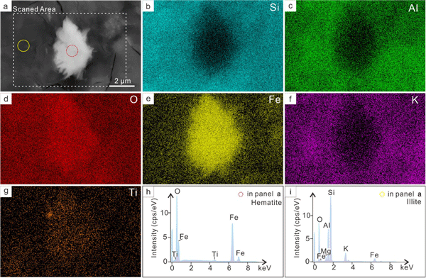 图2 下马岭组二段铁氧化物能谱面扫描和点分析结果