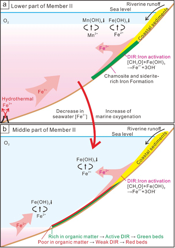 海相红层常见于沉积记录中,铁氧化物是其重要的致色矿物,因此常被用来指示海水氧化还原条件。但是,红层内铁氧化物存在碎屑、原生、早期或晚期成岩多种成因解释,而且不同成因的古环境意义可能完全不同。例如,有研究认为白垩纪的大洋红层是早期成岩阶段沉积物内含铁矿物被氧化而形成,这反映了充分氧化的海洋化学条件;但也有研究认为海相红层一般形成于缺氧向氧化的转折时期,红层内的铁氧化物是由未完全氧化水体中残余的Fe(II)氧化沉淀所致,反映了适度氧化的海水条件。中元古代的大气和海洋长期低氧,但在华北中元古代下马岭组(1.40-1.35 Ga)却发育了沉积于风暴浪基面之下的海相红层。这些红层的形成过程是怎样的?它们反映了怎样的海洋化学条件呢?