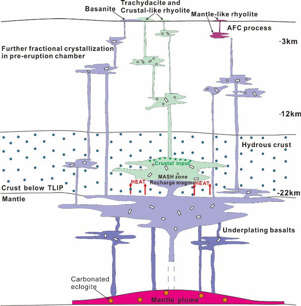 图1.塔里木大火成岩省镁铁质岩浆与长英质岩浆成因关系示意图