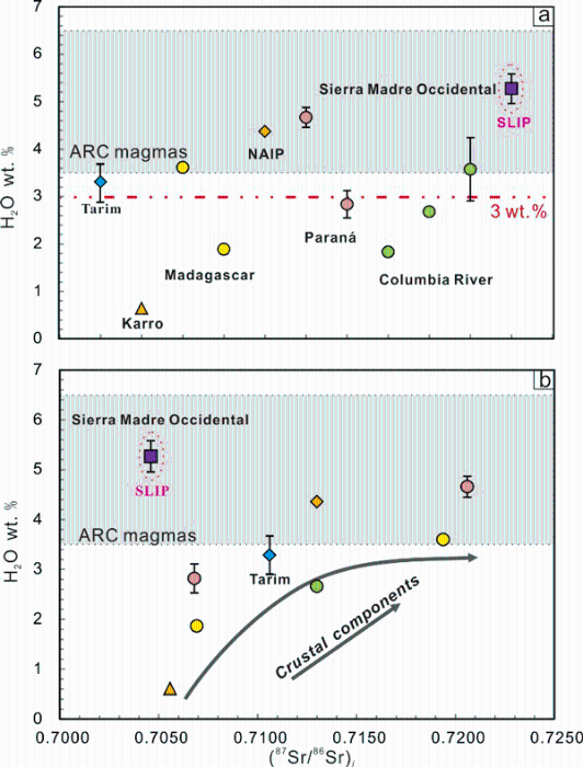 图2. (a)基于斜长石-熔体湿度计对全球典型的镁铁质大火成岩省和硅质大火成岩省的长英质岩石水含量估算结果;(b)长英质岩石水含量和全岩(87Sr/86Sr)i组成呈正相关关系