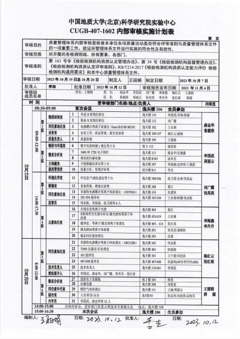 本次审核依据第163号令《检验检测机构资质认定管理办法》、第39号《检验检测机构监督管理办法》、《检验检测机构资质认定评审准则》、RB/T214-2017《检验检测机构资质认定能力评价 检验检测机构通用要求》和本中心质量管理体系文件。中心委派内审员郝金华、李国武、刘广耀、李海燕、杨红云、王丽娟、周丽云、李丹丹、张红雨、张亮亮、鲁颖淮、薛源共12名同志,到各部门对202310月内部审核中所开展的各检测领域、所有要素、各部门及所有质量活动进行审核。