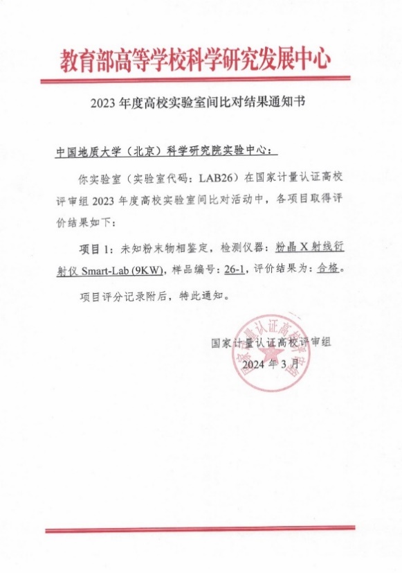 实验室间比对是判断和监控实验室能力的有效手段之一,也是检查计量认证管理体系是否有效运行的一次抽查考试。我中心粉晶衍射实验室顺利通过本次考核,充分证明了该实验室具有高水平的综合测试和分析技术能力,也是对我中心计量认证管理体系工作管理有序、有效的肯定。今后,实验中心将继续努力,为我校“双一流”建设和校内外高水平的科研工作提供了强有力的实验支撑。