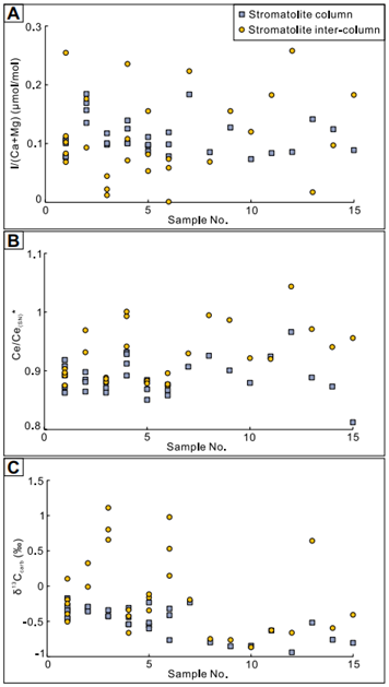 (1)铁岭组叠层石柱体和柱间展现出相似的I/(Ca+Mg)和稀土Ce异常特征(图2)以及富叠层石层段相较于贫叠层石层段具有更低的I/(Ca+Mg)(图3),共同表明铁岭组沉积期叠层石产氧能力有限,不足以显著提高海底的氧气水平。