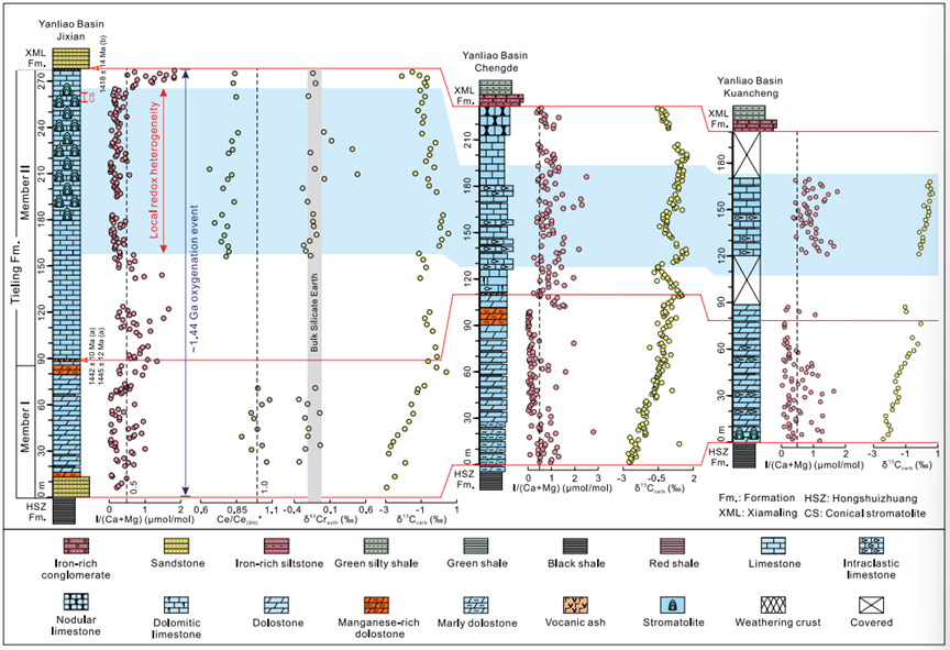 (3)结合铁岭组长序列多剖面的I/(Ca+Mg)和δ13C数据(图3),以及全球同期其他盆地海水氧化还原状态的研究,本研究提出~1.44 Ga增氧事件并非代表局部的海底氧气绿洲,而很有可能代表了跨多盆地的浅海广泛增氧事件。