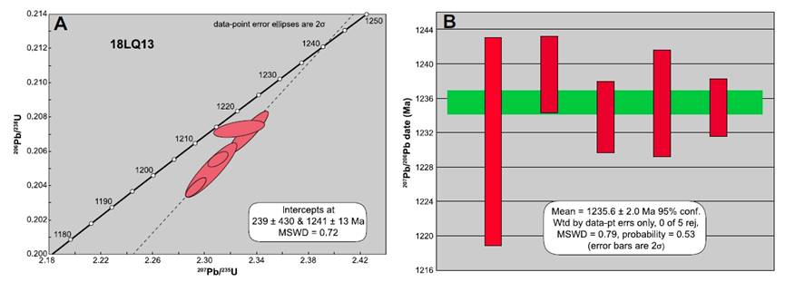 (1)ID-TIMS斜锆石定年结果显示,其中一条岩墙的侵位时间被精确限定在1235.6 ± 2.0 Ma(图1)。来自25条岩墙获得较一致的倾向东向下中等角度的古地磁结果。两个烘烤检验限定这些岩墙记录的古地磁方向应该为岩墙侵位时获得的原生剩磁。新的年龄和古地磁结果,结合之前发表的古地磁结果为华北克拉通增加了一个新的可靠的中元古代晚期古地磁极。