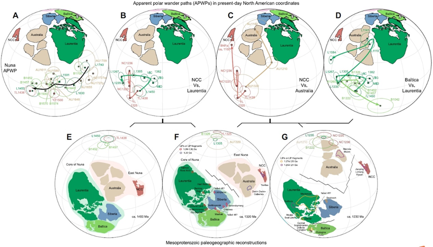 图2. (A-D)劳伦、西伯利亚、波罗的、澳大利亚和华北等视极移曲线对比。(E-G)Nuna超大陆的逐步裂解