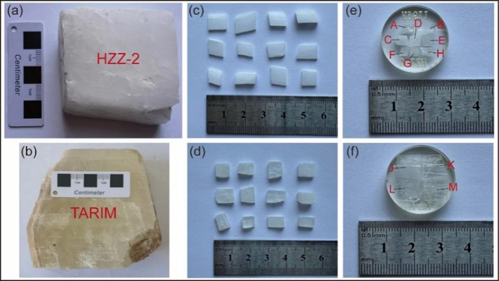 图1 (a)HZZ-2方解石手标本;(b)TARIM方解石手标本;(c)被切成小块进行随机均匀性检验的HZZ-2方解石;(d)被切成小块进行随机均匀性检验的TARIM方解石;(e)被制成靶的HZZ-2方解石样品;(f)被制成靶的TARIM方解石样品