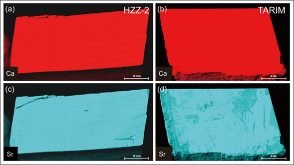 μ-XRF、EPMA和LA-ICP-MS元素及Mapping分析显示(图2、3),HZZ-2和TARIM方解石具有均匀的主微量元素组成、相对适中的Sr含量(HZZ-2:~1100 μg·g-1,TARIM:~620 μg·g-1)、极低的Rb/Sr比值(< 0.00001)以及较低的MgO含量(HZZ-2:0.21 wt%,TARIM:0.15 wt%),化学成分表明它们属于低镁方解石。