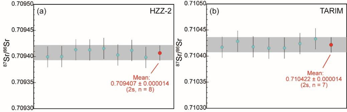图4 HZZ-2方解石(a)和TARIM方解石(b)的TIMS Sr同位素分析结果