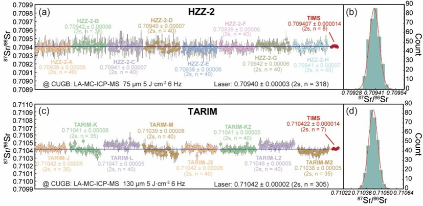 图5 HZZ-2方解石(a、b)和TARIM方解石(b、d)的LA-MC-ICP-MS Sr同位素分析结果及高斯分布图