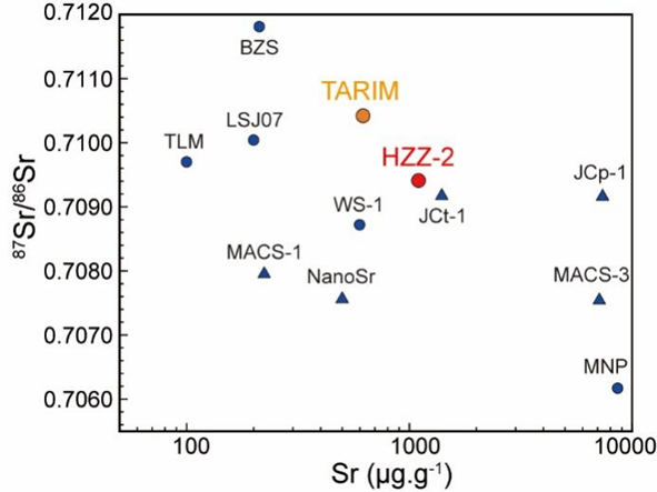 针对以上问题,中国地质大学(北京)科学研究院朱弟成教授团队硕士研究生李豪杰,在张亮亮副研究员的指导下,利用矿物激光微区分析实验室(Milma Lab)的LA-MC-ICP-MS仪器,开发了两种新的可用于激光原位Sr同位素分析的天然方解石标样(HZZ-2和TARIM,图1)。它们具有适中的Sr含量,可以同时满足高Sr和低Sr方解石样品的分析要求。