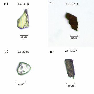 图1:常温下的绿帘石和黝帘石(a1,a2),1223K氘代后的绿帘石和黝帘石样品(b1,b2)