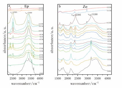 图2:红外光谱显示绿帘石(a)和黝帘石(b)的-OH在573K被激活