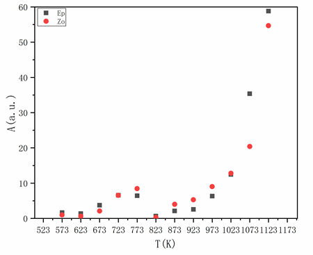 图3:红外光谱中绿帘石和黝帘石的-OD特征峰的积分面积(A)随温度的变化情况