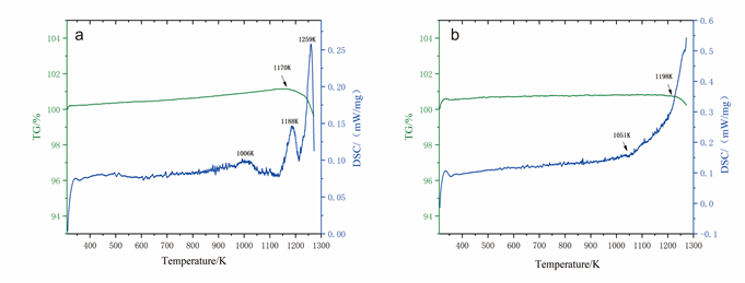 图4:热重实验显示绿帘石(a)和黝帘石(b)分别在1170K和1198K开始发生脱水失重