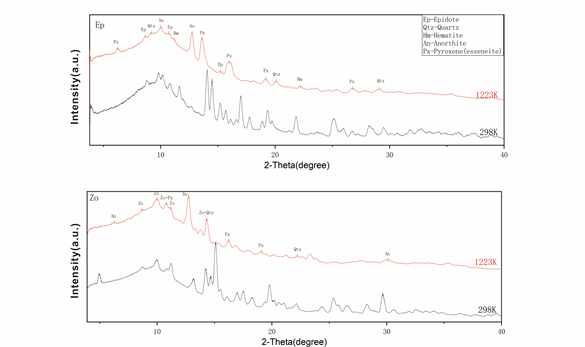 图5:绿帘石和黝帘石在1223K温度下分解并生成新的物相