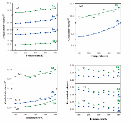图6:高绿帘石和黝帘石的M八面体体积随温度的升高而增大,且M3八面体的膨胀最显著
