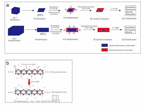 图7:(a)绿帘石和黝帘石高温H+扩散与脱水分解过程;(b)氘代过程中H-D替换示意图
