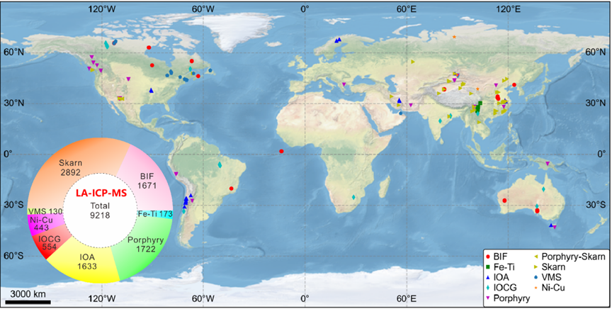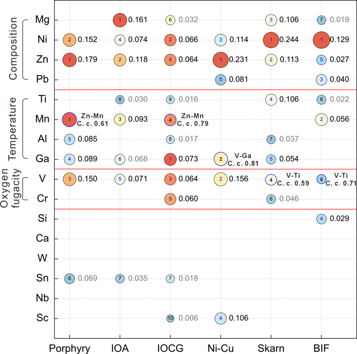 搜集编汇了LA-ICP-MS分析的全球166个矿床的磁铁矿微量元素数据9218条(图1)。统计分析了主要矿床类型的磁铁矿钴含量特征。通过机器学习的特征重要性主要评价了数据量较大的斑岩型(Porphyry)、铁氧化物型(IOA)、铁氧化物铜金型(IOCG)、岩浆型镍铜硫化物型(Ni-Cu)、矽卡岩型(Skarn)和沉积变质型(BIF)矿床中影响磁铁矿钴含量的主要因素。