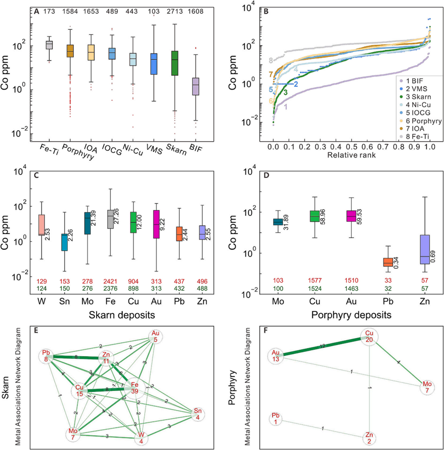 (A – 磁铁矿中钴含量(log10)箱线图;黑色数字表示数据量。B – 磁铁矿钴含量排序图。C、D – 矽卡岩性和斑岩型矿床中磁铁矿钴含量箱线图,红色数字表示原始数据量,绿色数字表示通过箱线图方法移除一次异常值后的数据量。E、F – 矽卡岩型和斑岩型矿床中金属矿化组合的网络图。图E和F中圆圈内标签表示矿床的金属矿化类型和频数,连接线上的数字表示金属组合的频数)