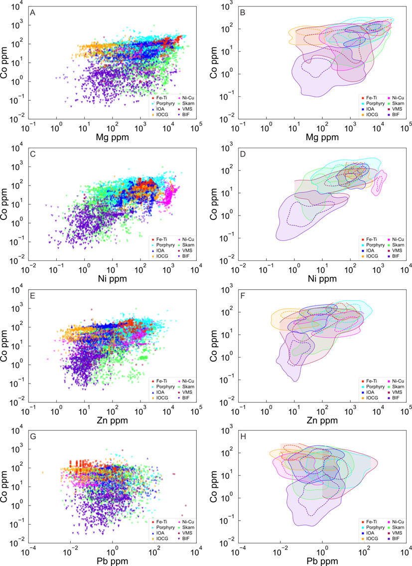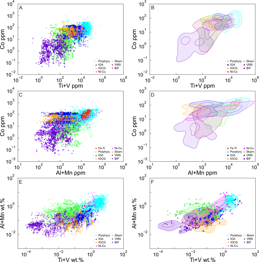 磁铁矿中的钴(Co)含量因矿床类型而异。在岩浆铁钛矿床(Fe-Ti)中钴含量最高,其次是斑岩型(porphyry)、铁氧化物型(IOA)、铁氧化物铜金型(IOCG)、岩浆镍铜硫化物型(Ni-Cu)、火山块状硫化物型(VMS)和矽卡岩型(skarn),而沉积变质型(BIF)磁铁矿的钴含量最低(图2A、B)。此外,以矽卡岩和斑岩矿床为例,矽卡岩型Fe和Cu矿床的磁铁矿钴含量通常高于矽卡岩型W、Sn、Pb和Zn矿床(图2C、E)。斑岩型Cu、Au矿床的磁铁矿钴含量普遍高于斑岩型Pb、Zn矿床(图2D、F)。