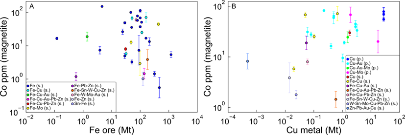 (A – 矽卡岩矿床铁矿石储量与磁铁矿钴含量关系图;B – 斑岩和矽卡岩矿床铜金属量与磁铁矿钴含量关系图;s.-矽卡岩;p.-斑岩。数据源自洪双等, 2021; Huang et al., 2019; Makvandi et al., 2016; Wang et al., 2024; Zhang et al., 2023,以及其中的参考文献)