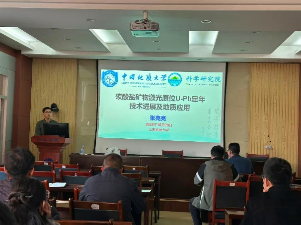活动伊始,年代学平台党支部书记张亮亮受邀为地球科学与工程学院师生作题“碳酸盐矿物激光原位U-Pb定年技术进展及地质应用”的学术报告。报告从碳酸盐矿物激光原位U-Pb定年原理、测试手段、研究方法到地质应用,系统阐释了该技术的前沿动态,现场学术氛围浓厚。在随后的交流环节,张亮亮与在场师生进行了深入探讨,不仅详尽答疑,更就未来在相关地质领域的合作提出了具体设想,为后续协同研究奠定了坚实基础。