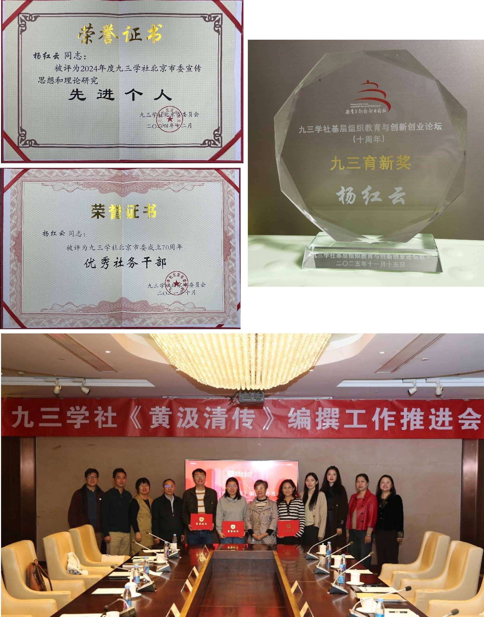 凭借突出的工作实绩,杨红云同志先后荣获“2024年度九三学社北京市委宣传思想和理论研究先进个人”、“海淀区2024组织工作特等奖”、“海淀区2024档案工作特等奖”、“九三学社北京市委成立70周年优秀社务干部”等荣誉,更在第八届九三学社基层组织教育与创新创业论坛中斩获“九三育新奖”,以专业实力与责任担当展现了统战人士的卓越风采。