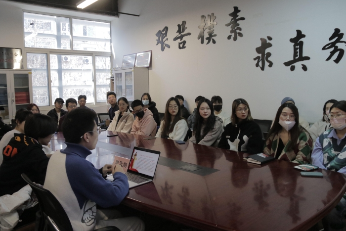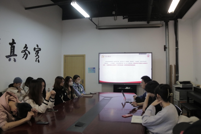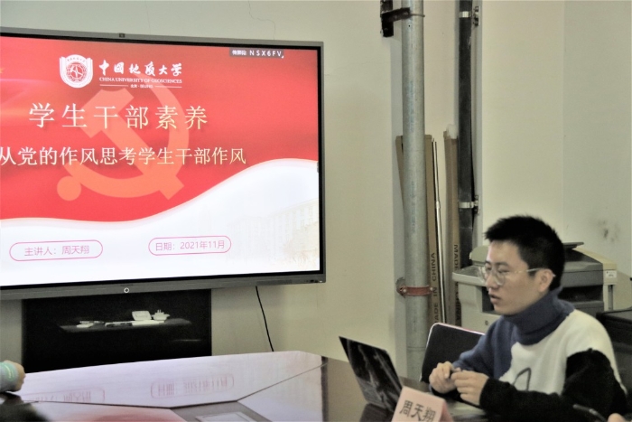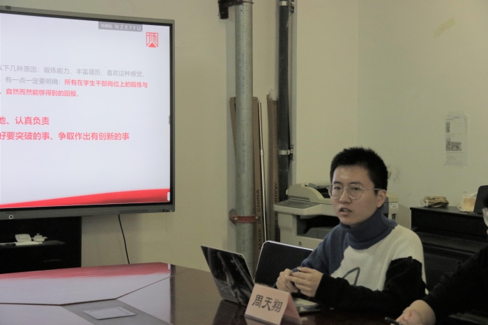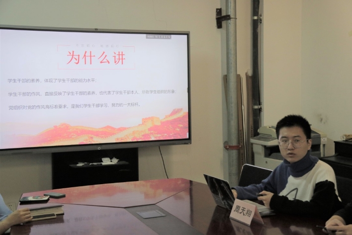 2021年11月22日中午12时30分,以“从党的作风思考学生干部作风”为主题的学生干部素养讨论会于体育馆203会议室顺利召开。会议由艺术团团长辛宇豪主持,马克思主义学院团委书记、辅导员周天翔主讲。一同出席本次会议的还有艺术团主席团和各分团团长。