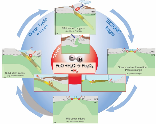 以往的科学研究证实天然氢气主要分布在以洋中脊、裂谷、汇聚板块边缘蛇绿岩带等为代表的构造活动带和以前寒武纪大陆基底、盆地沉积盖层为代表的构造稳定区。不同构造背景下天然氢气的来源也存在一定差异,科学家认识到水岩反应、核幔内部深源氢脱气、水的辐射分解以及有机质(生物)分解可能是天然氢气形成的主要机制,这其中又以蛇纹石化为特征的水与含铁矿物的反应占主导地位。