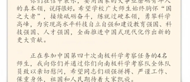 南北极科学考察队师生代表的回信,掀起了我校参与南极科考师生学习回信精神的热潮,大家纷纷表示要以回信精神为指引,坚持用国家的大事业磨砺真本领,顽强拼搏、严谨工作、不负期望,高质量完成考察…